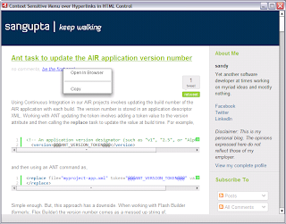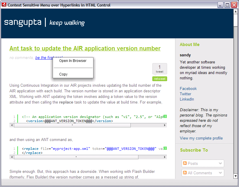 In this post we will try and look on how to add a custom context-sensitive menu on hyperlinks present in an HTML page loaded inside an AIR HTML control. We would two menu options called, ‘Open link in Browser’ and ‘Copy Link’ to the context-sensitive menu. To achieve the same adopt the following procedure,